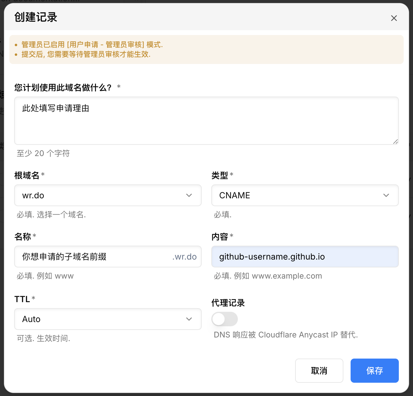 Then back to https://wr.do/dashboard/records, config the CNAME content: